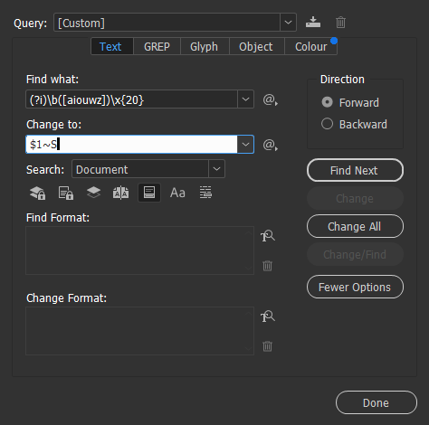 (?i)– Case Insensitive. Sprawia, że InDesign ignoruje wielkość liter (znajdzie zarówno „a” jak i „A”).\b– Word Boundary. Granica słowa. Zapobiega znajdowaniu liter w środku wyrazów (np. nie znajdzie „u” w słowie „auto”).([aiouwz])– To jest najważniejsze. W nawiasie kwadratowym wymieniamy nasze spójniki. Nawias okrągły tworzy grupę, którą zapamiętamy.\x{20}– To kod szesnastkowy zwykłej spacji.